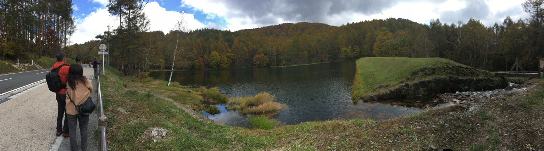 コレって紅葉してるんですよね、たぶん。下手くそな僕のスナップでも良い感じにフレームの中に紅葉が収まります。でも、実はパノラマ写真で見ると分かるようにかなり小さい溜め池だったりして