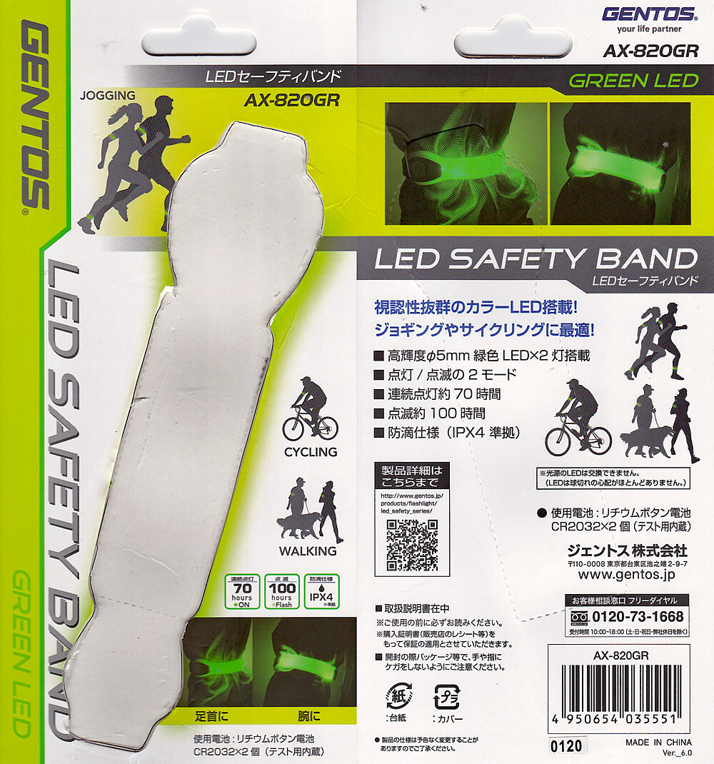 安全のために首にダイソーのLEDライトを提げていますが、後方への注意喚起のためにGENTOS LEDセーフティバンドを買いました。