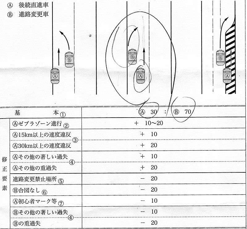 判例によると過失割合は被害者である僕Aが30%、進路変更してきた加害者Bが70%で、事故の内容により5%刻みの修正になるようです。加害者の合図なし-20%とナビを見てた著しい過失-10%がどれだけ認められるかです。