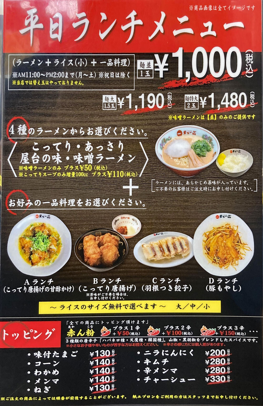 平日の昼はライスが無料なんですね。こってりラーメン並+ライス+一品料理=平日ランチ1000円専門なので知りませんでした