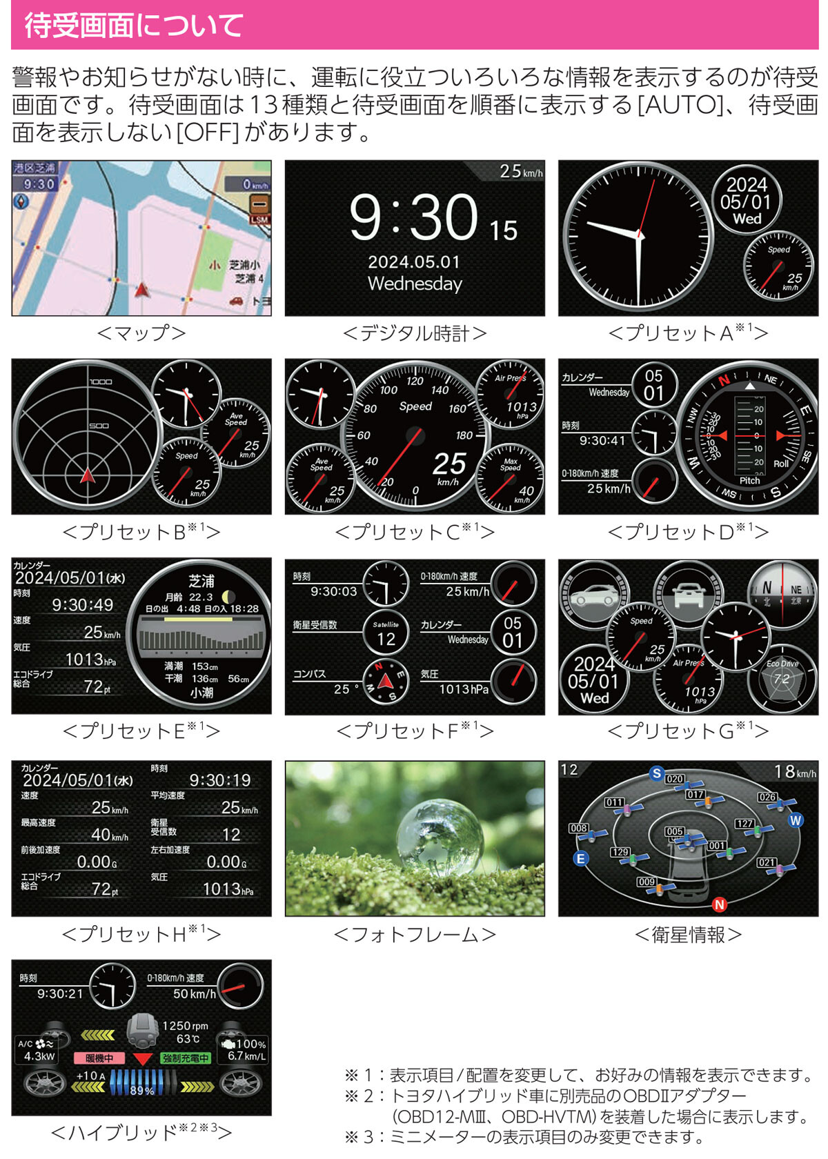 待受画面は13種類、さらにカスタマイズもできるらしい。