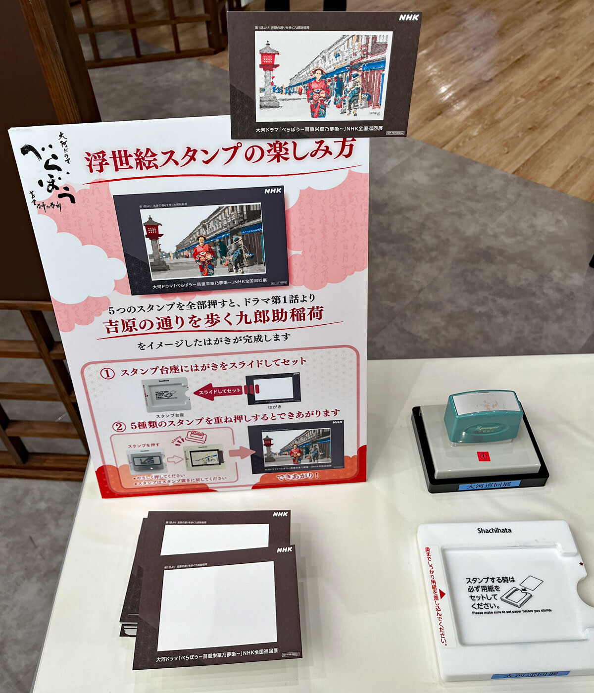 スタンプ台座にハガキをセットし、色が違う5種類のシャチハタを順番に押すと誰でも(=僕でも)簡単にカラーの浮世絵スタンプが出来て、メチャ良いです♪