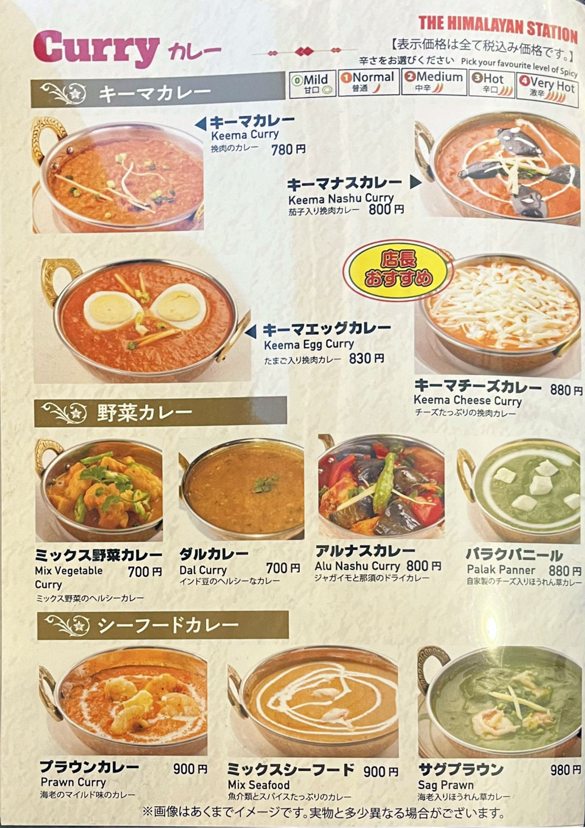 - Curry カレー キーマ / 野菜 / シーフード 辛さ:甘口/普通/中辛/辛口/激辛