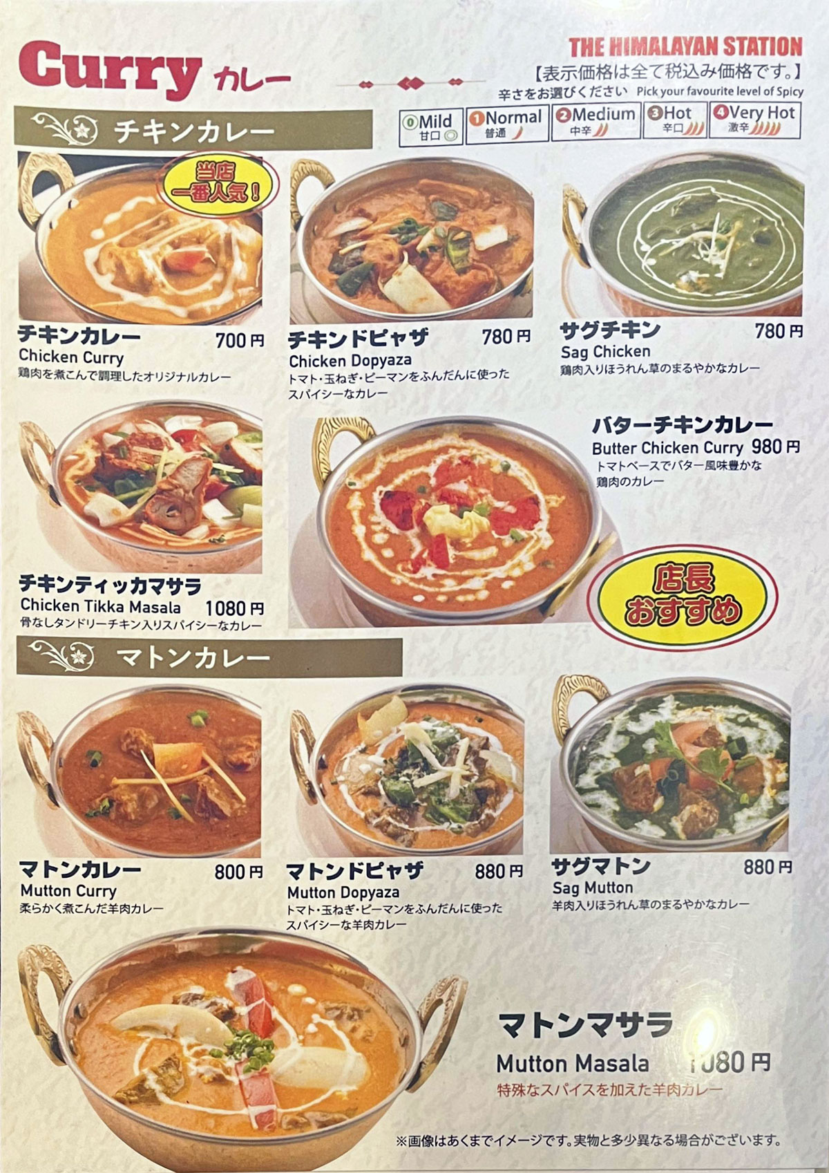 - Curry カレー チキン / マトン 辛さ:甘口/普通/中辛/辛口/激辛