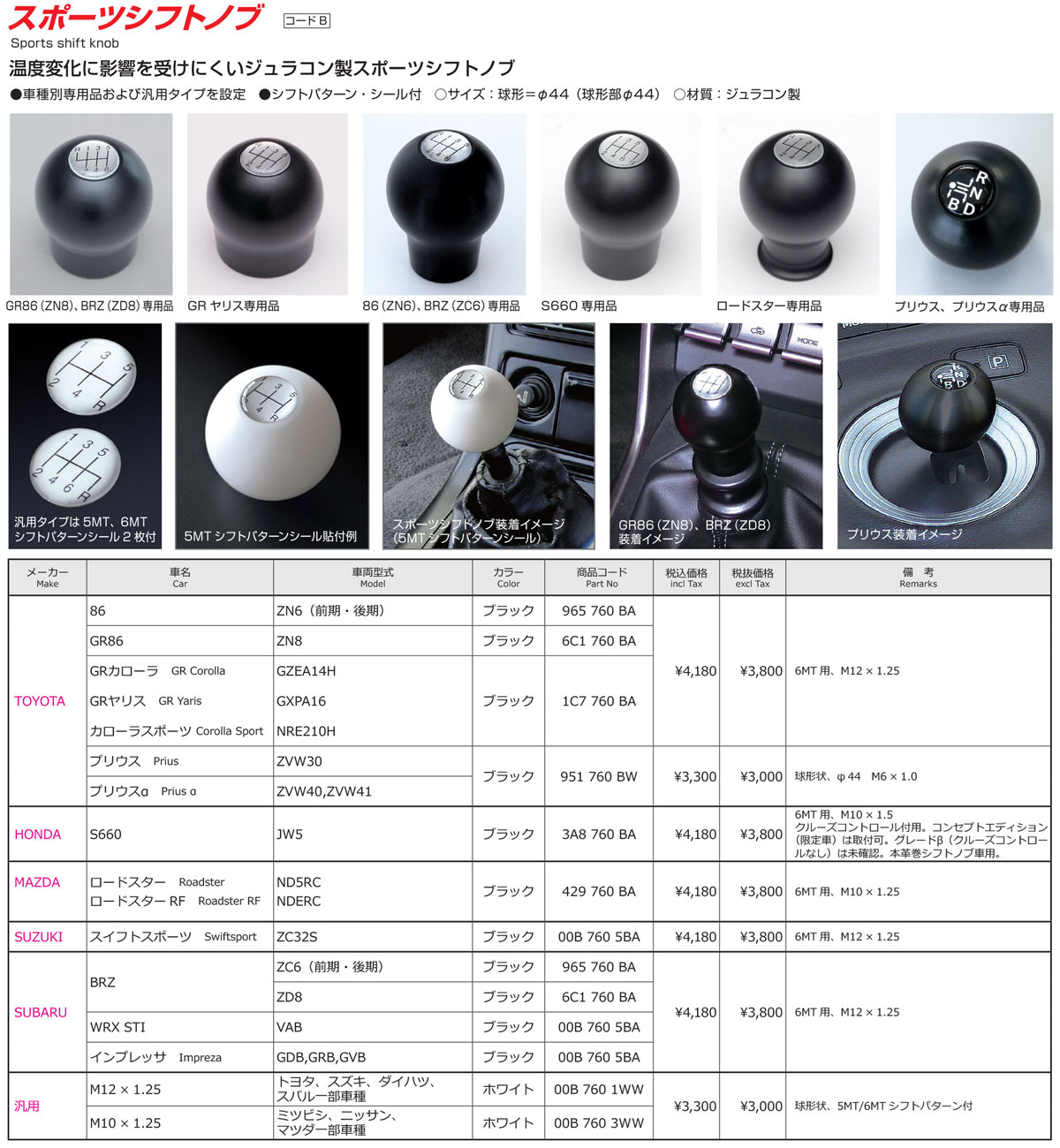 同じトヨタのスポーツカーでもシフトノブが違い、CUSCO クスコはジュラコン製を各種販売してます。