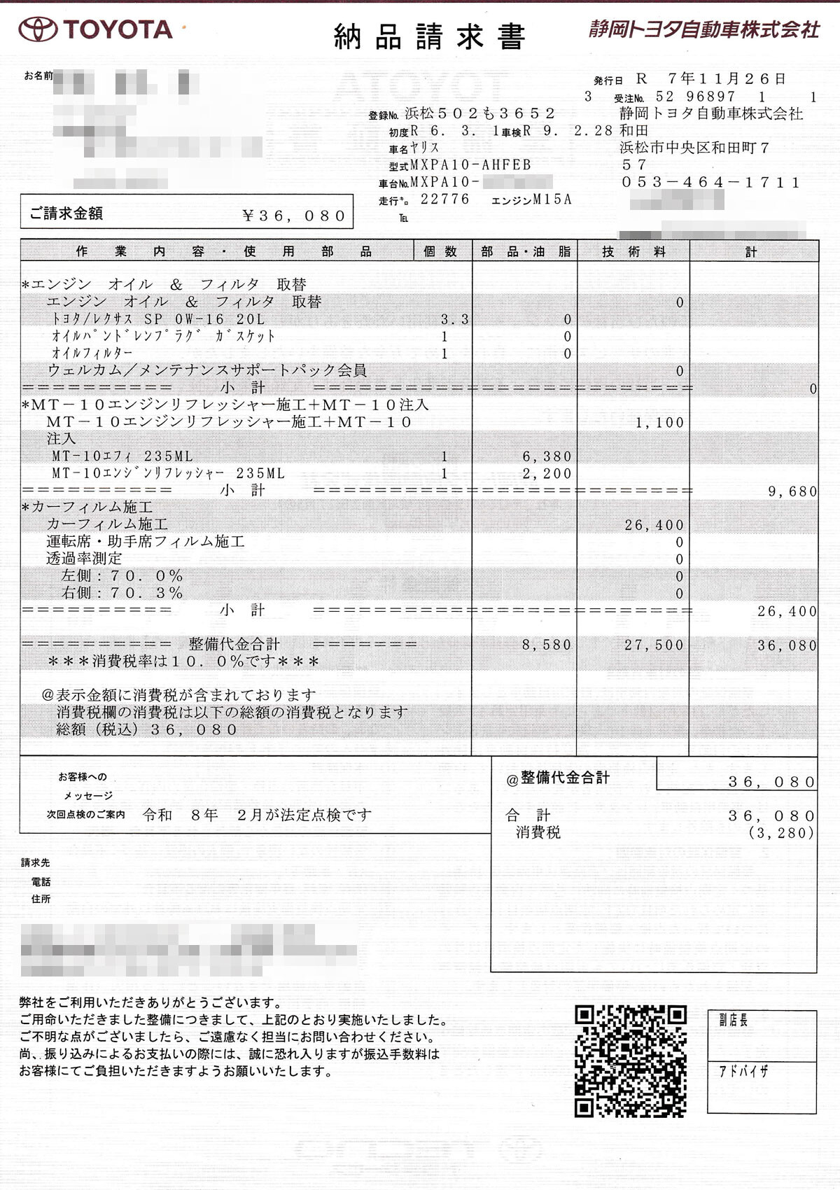 - 250828 ヤリスMT 1.5年点検+透明遮熱フィルム施工見積り